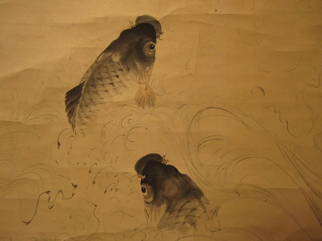 二尾の鯉が滝に向って一生懸命荒波の中を泳いでいるさまを、巧みな筆さばきで描いています。