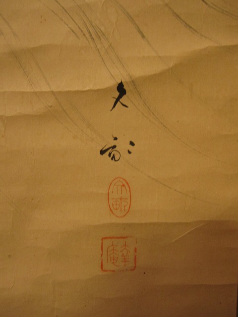 此の絵は、下の軸棒の付け根から表装が破れ無惨な状態で店に掛けて在りました、ネズミのおしっこか波のあたりにシミもあります。