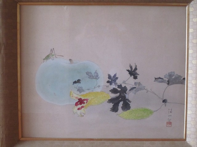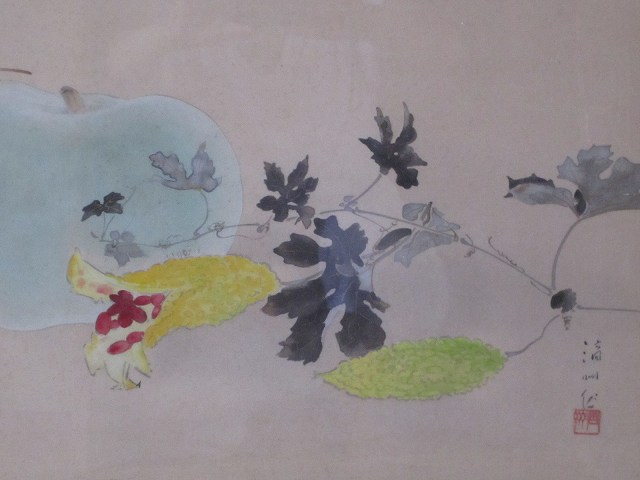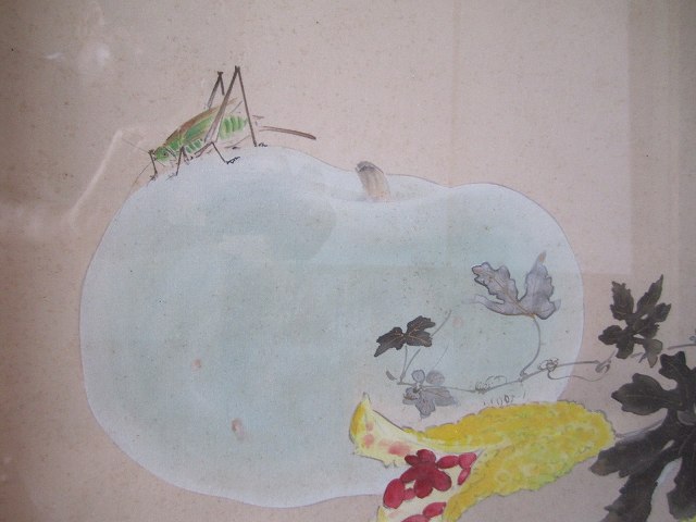 夏の野菜と小さな虫をモチーフに季節感を現す日本画の典型的なものです。