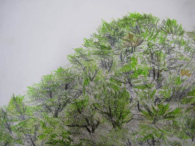 作業終了後の早朝に一つ山下の駐車場より春の木の萌えた頃のスケッチです。