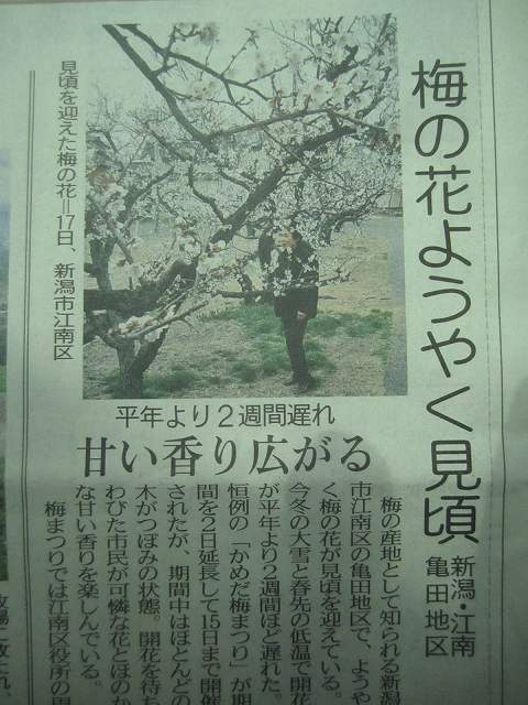 昨日仕事の帰り道に亀田アピタの近くの桜を撮影しましたが、そのあとに事務所へ帰る途中に此の梅畑があります、梅の花も満開で亀田は「梅まつり」ということもあり散作者もちらほらと、のどかな状景です。