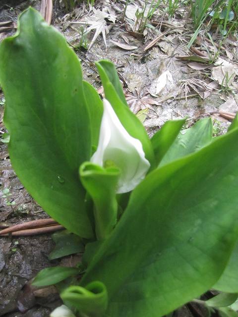 玄関先の庭に咲いた小さな水芭蕉です、奥様のおっしゃるには今年は寒かったぶん「水芭蕉の花にはかえって良かったみたいだ」との事でした。