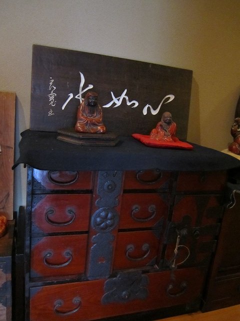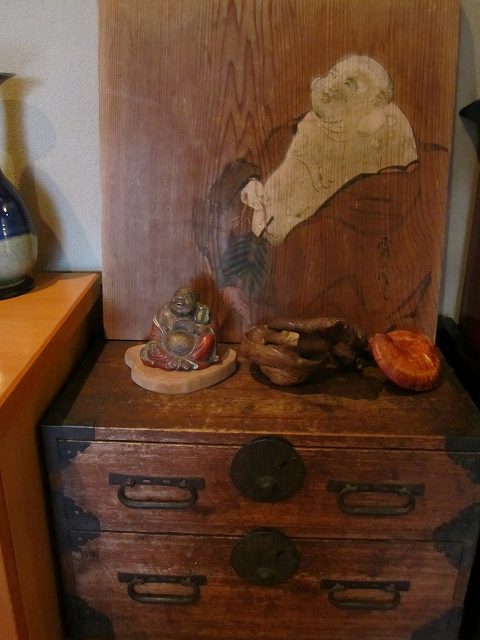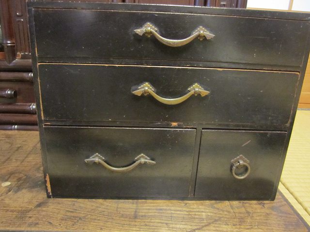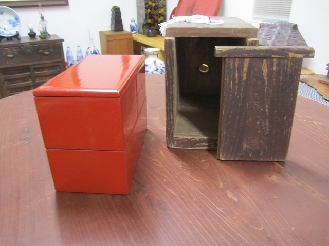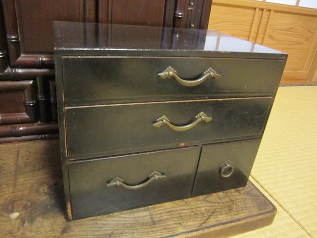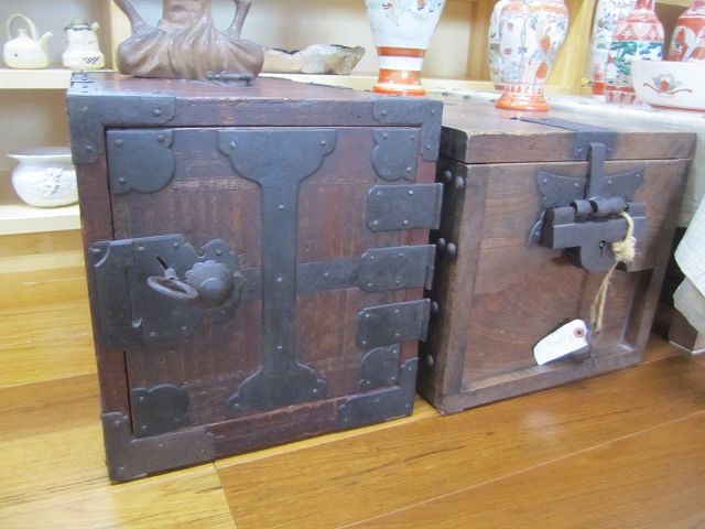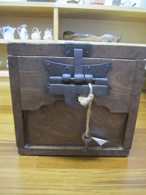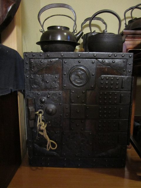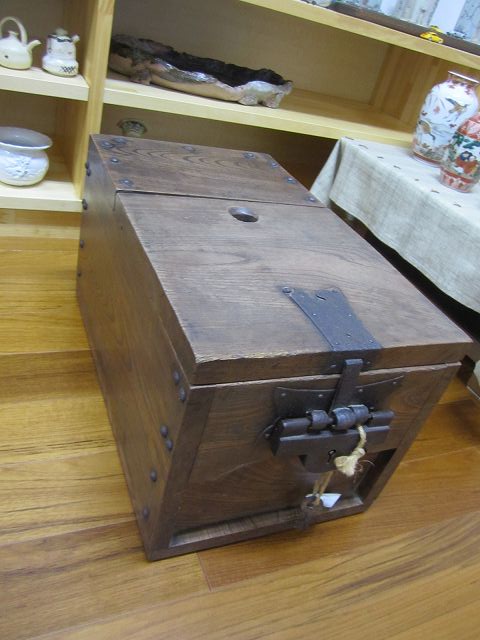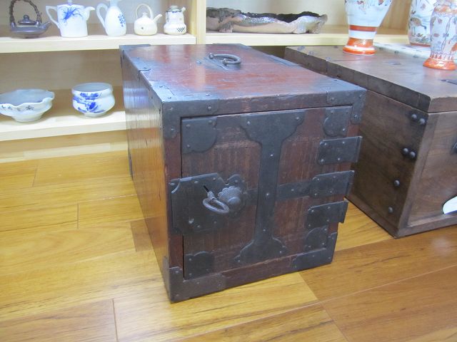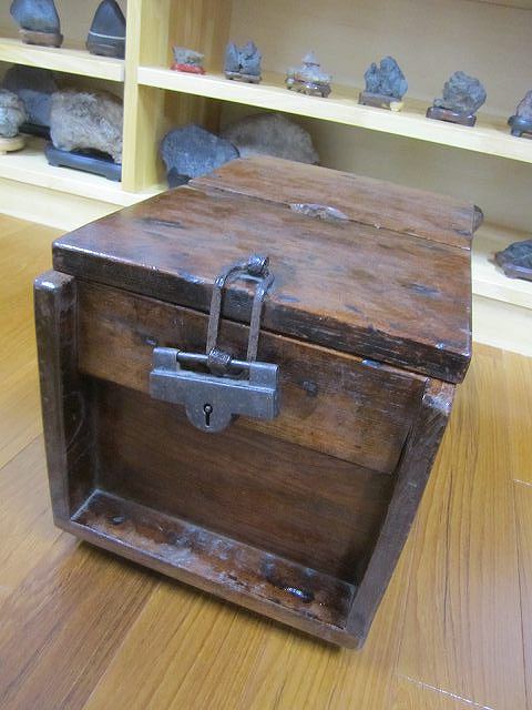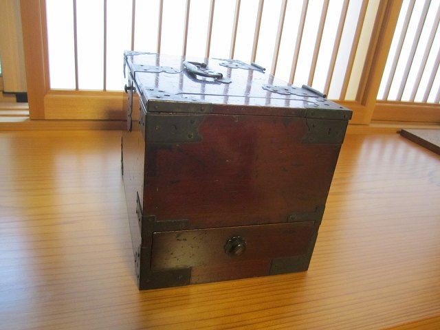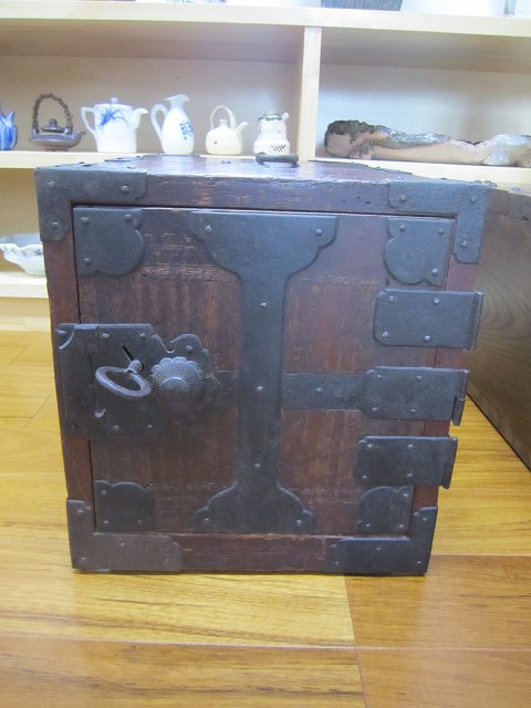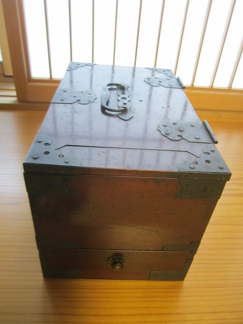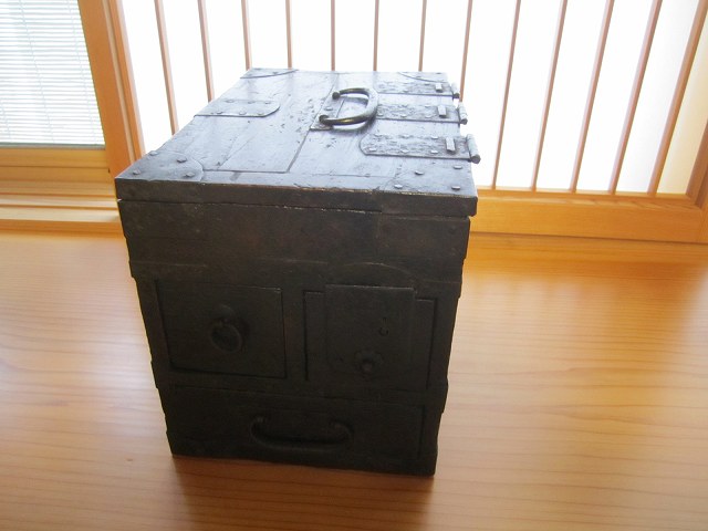 昔の手持ち金庫でしょうか。 此の金庫がいつの時代の物かはわかりません。 ただイメージとしては、江戸時代の気質が残っていた頃だろと想像しています。 江戸時代の後半は大変治安がよかったそうです、木箱の引き出しに鍵があればもうそれで、それは「誰も無断で開けてはいけなよ」とのサインだそうです。 つまり鍵が掛かっていてもいなくても、もうそれには誰もてを出さないものだったそうです。 此の話はNHKテレビの歴史番組で見て感心したものです。 セキュリテ―会社がいてもダメな今の日本とは大違いだったのですね。